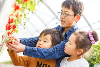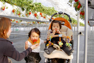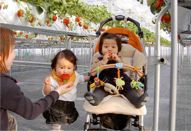 ハウス内の地面には全面シートが張ってあり、通路も十分な広さを取っておりますので、 車椅子やベビーカーでもいちご狩りが楽しめます。