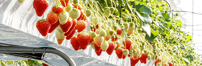 高設栽培システムとは、いちごを地面から1メートルほど上げた培地に植えて育てるシステムです。 いちごが空中に浮いているので、土が付着せず、そのままもぎ取って食べることができます。 また空中に浮いているため、いちご狩りは立ったまま摘み取りが出来、ハウス内の地面には全面シートが張ってあるので、 車椅子やベビーカーでもいちご狩りが楽しめます。 もちろん雨の日でもOK!長靴を履くこともなく園内に入っていただけます。