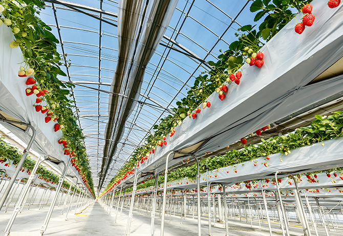約13,500平米の広大な敷地には、77,000株のいちごがぎっしり! スタッフ一同愛情を込めて大切に育てています。